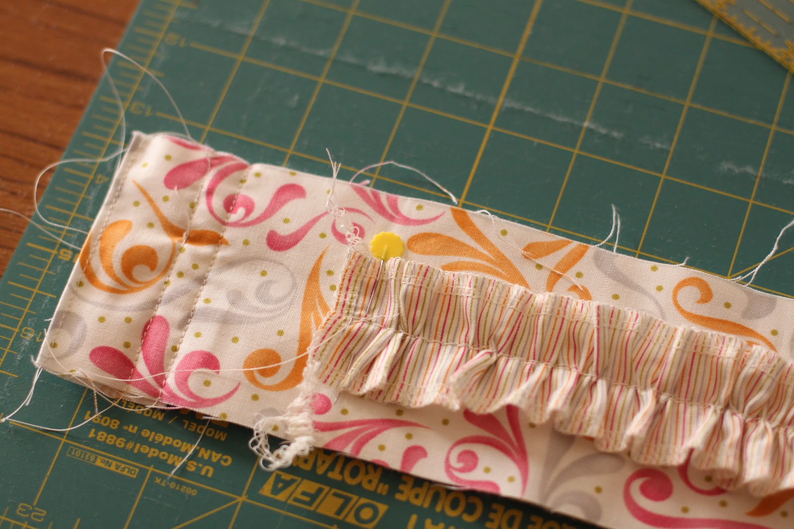 F. Decide placement of the ruffle on one of your straps and pin the ruffle in place (see picture below). Sew in the center of your ruffle to secure to strap.